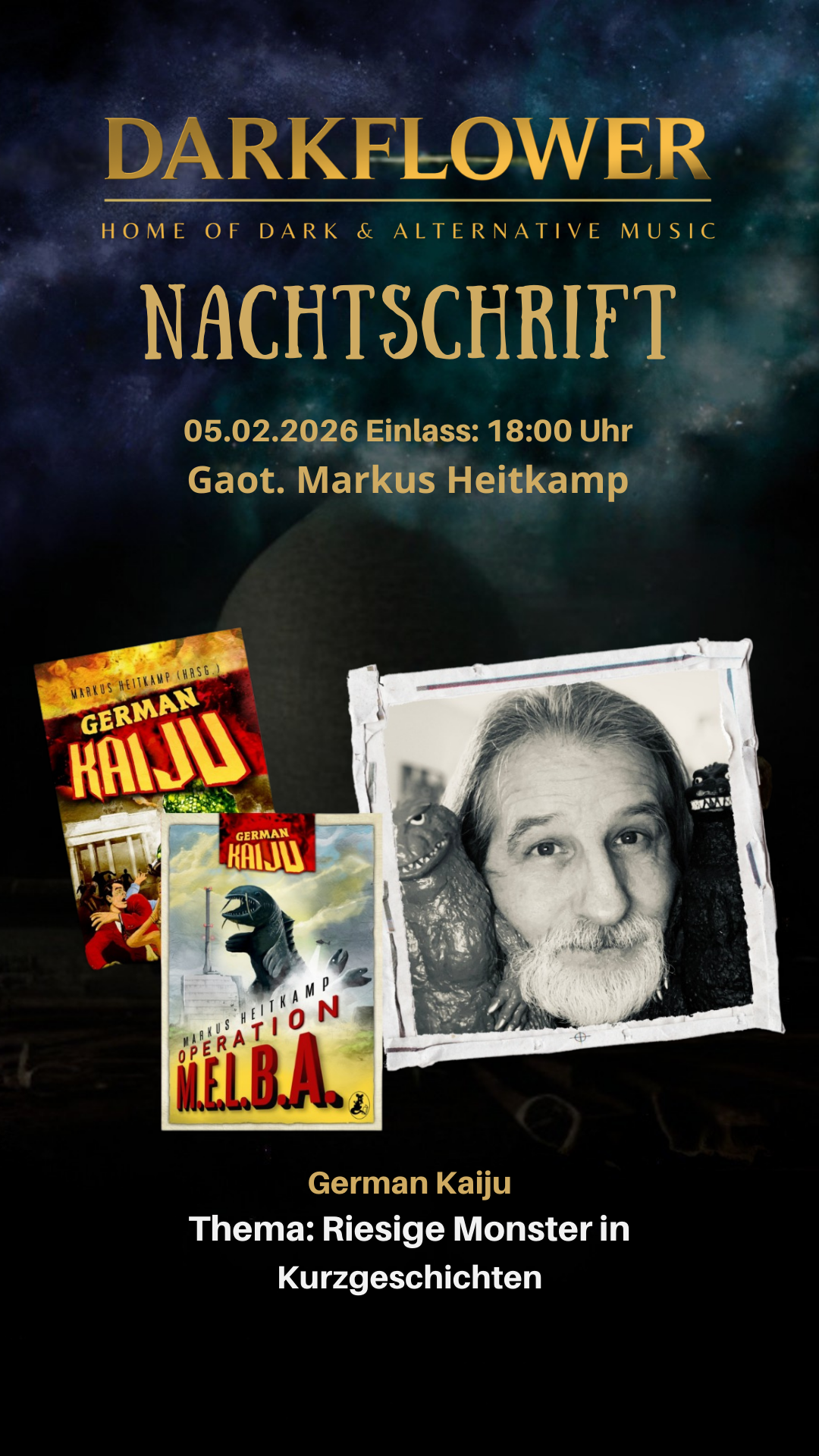 Mit Markus Heitkamp spreche ich über die Faszination für das riesige, das überdimensionierte Bedrohliche – und darüber, wie man all das überhaupt in Sprache übersetzt. Was macht den Reiz von Kaiju aus? Warum funktioniert das Motiv auch ohne Filmkulisse? Und was passiert, wenn man diese Kreaturen auf unsere sehr deutschen, sehr realen Schauplätze loslässt?