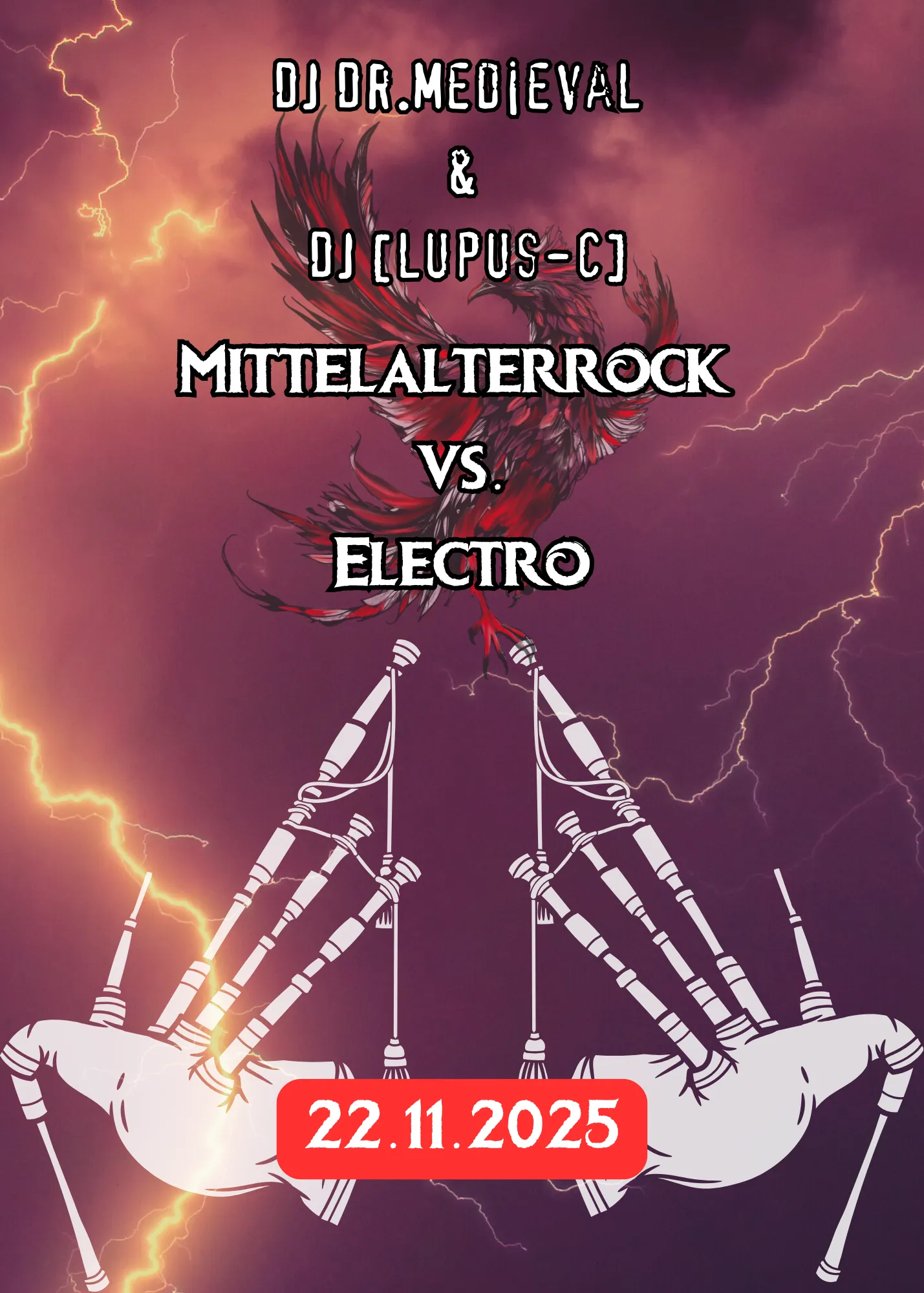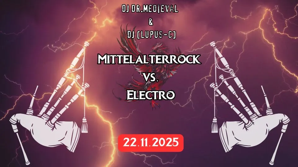 Mittelalterrock trifft auf Electro und vertreten wird das Ganze durch DJ [lupus-c] und DJ Dr. Medieval. Wir freuen uns auf euch!