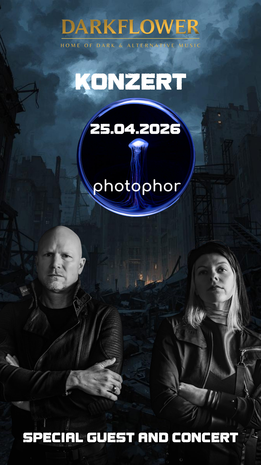 Homepage: https://photophor.bandcamp.com/ https://www.facebook.com/photophor.official/ Photophor sind ein noch junges, aber bereits markantes Projekt der schwarzen Szene. Das Duo formierte sich 2024 und verfolgt seitdem eine klare künstlerische Vision: düstere Klanglandschaften, die zugleich emotional, poetisch und tanzbar sind. Der Bandname verweist auf die geheimnisvollen Leuchtorgane tiefseebewohnender Kreaturen – ein Bild, das die Atmosphäre ihrer Musik treffend beschreibt: dunkel, faszinierend und durchzogen von unerwarteten Lichtmomenten. Sänger und Gitarrist Asch sowie Keyboarderin und Bassistin Kate erschaffen gemeinsam melancholische Soundwelten zwischen dunkler Elektronik, treibenden Beats und eindringlichen Gitarren. Ihre Texte greifen Themen unserer Zeit auf – von sozialem Wandel über digitale Entfremdung bis hin zu persönlicher Verletzlichkeit – und verbinden gesellschaftliche Beobachtung mit intensiver Emotionalität. Dabei vermeiden Photophor bewusst klare stilistische Schubladen. Statt sich an bestehenden Bands zu orientieren, entwickeln sie ihren eigenen Klang: eine Mischung aus dunkler Melancholie, tanzbarer Härte und poetischer Ausdruckskraft. Live entfaltet diese Musik eine besondere Wirkung – atmosphärisch dicht, energetisch und zugleich nachdenklich. Ein Konzert von Photophor ist eine Reise durch Schatten und Licht, die gleichermaßen zum Tanzen wie zum Innehalten einlädt. 🖤🎶